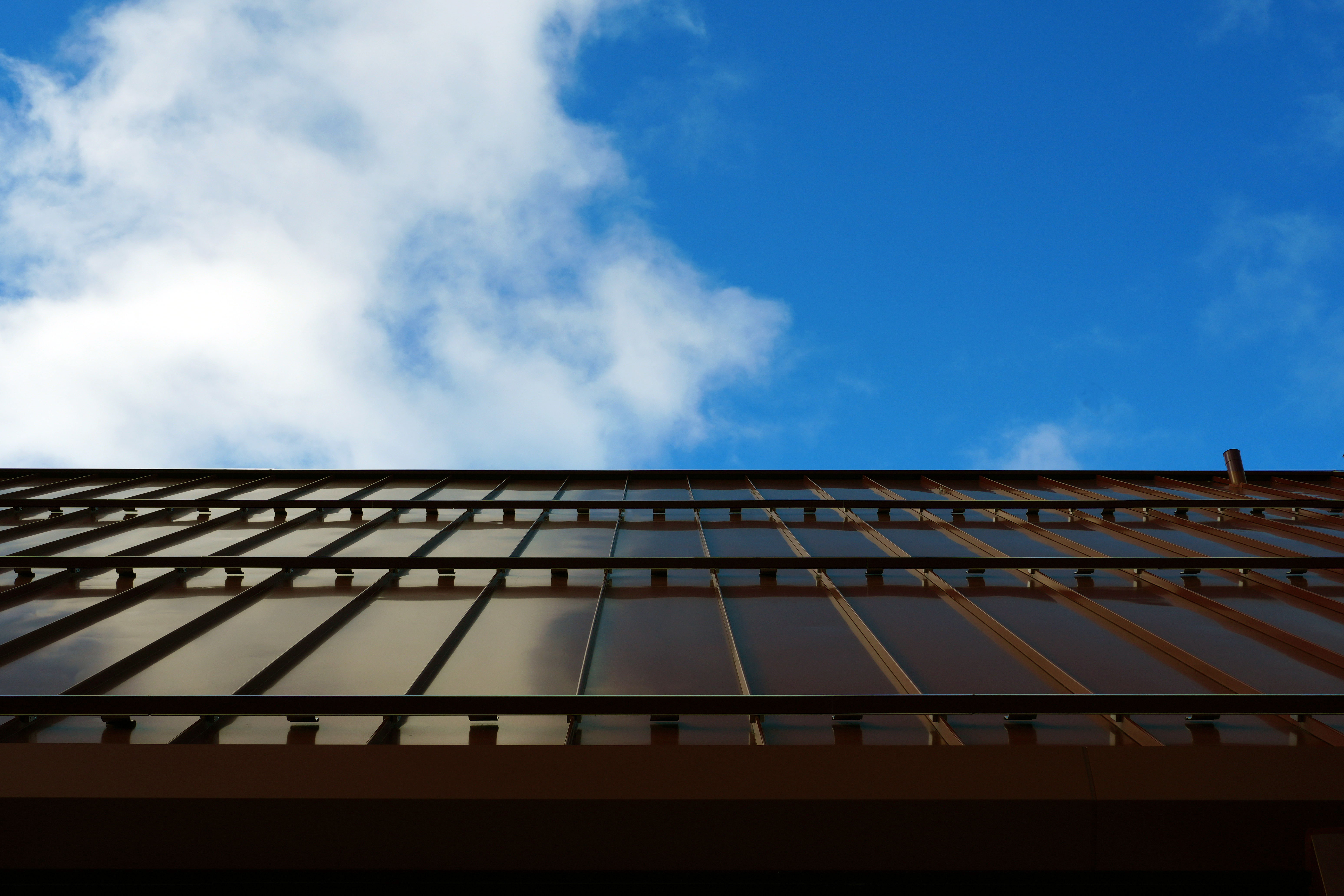 On the façades and roof, Dutch Seam panels, model MRD194, in 1.0 mm (0.040″) aluminum, PVDF finish in Redwood (07) color.